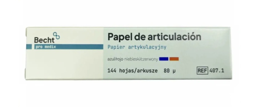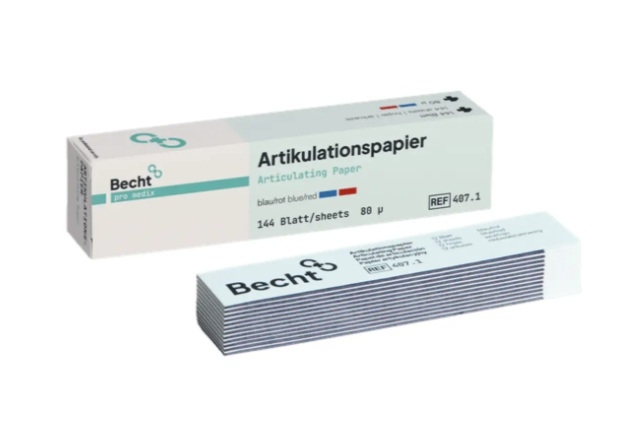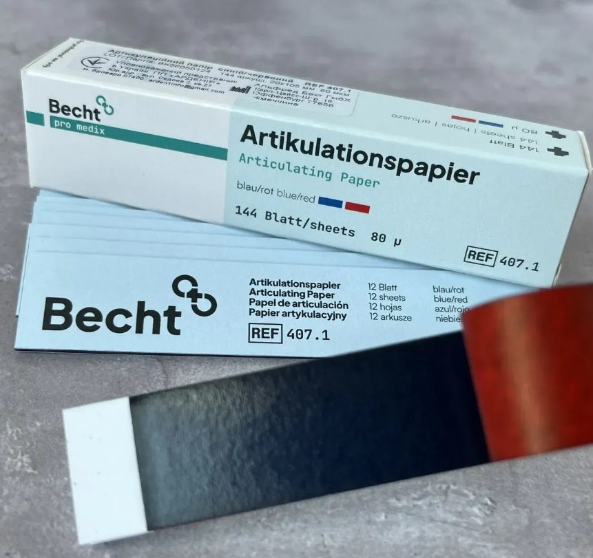 Артикуляционная бумага «Alfred Becht» без затруднений накладывается на зубную поверхность и не требует применения специальных фиксирующих вилок и пинцетов. С помощью такой бумаги врач может сразу распознать, какая из сторон предпочитается при акте жевания.